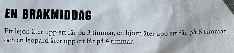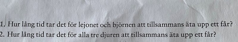 1. Skall man hitta tiden som ett lejon och en björn tillsammans kräver för att få i sig ett får skall man lösa ekvationen