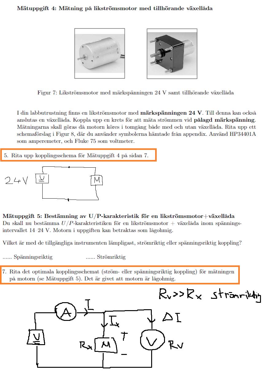 Bör det vara en strömriktig koppling på uppgift 7? resonemanget är att motorn sägs ha en låg resistans, och har då läst att man bör använda en strömriktig koppling då.