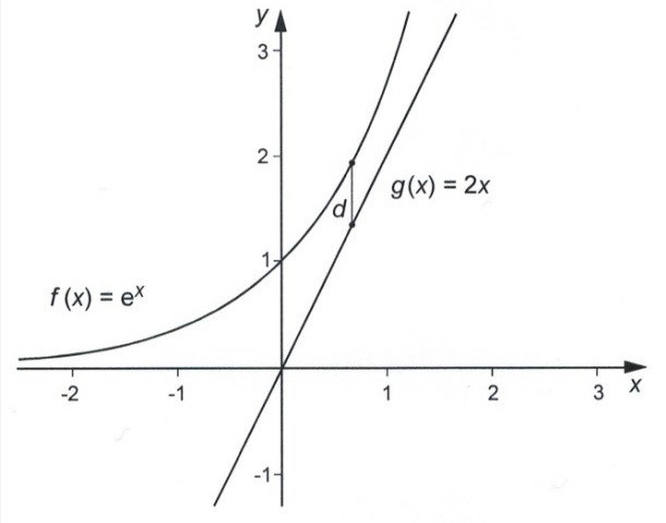 Beräkna det kortaste vertikala avståndet d mellan kurvan f(x) och linjen g(x) (se figur). Svara exakt.