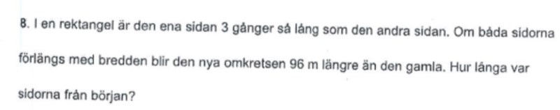 Längden (l) är tre gånger bredden (b) => l = 3*b. Omkretsen är två bredder plus två längder = 2*l + 2*b. Om l och b förlängs med bredden blir de l + b respektive b + b = 2*b. Så den större rektangelns omkrets är 2*(l + b)+ 2*2*b och den är 96 + den gamla omkretsen, dvs 2*l + 2*b + 96. Sätt dem lika så får du