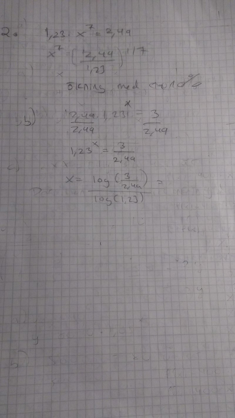 a) Jag fick också svaret till att priset ökade med cirka 10 % per år, men du behöver redovisa bättre! Det är som är lika med 2,4/1,23, och så måste du visa att du drar sjunderoten ur detta för att få fram 1,10.En modell för radhusets värde är där f(x) är priset i miljoner kronor och x är antalet år efter 2001.