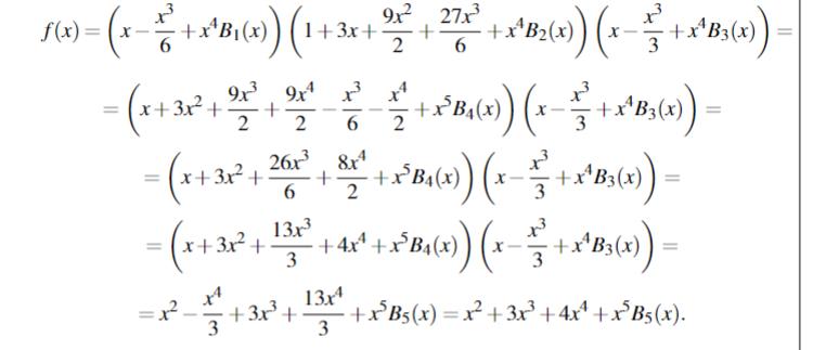 Produkten av de 2 första parenteserna i första raden är uppenbarligen inte lika med den första parentesen i den andra raden. Dock finns det en okänd funktion B4(x) med i den andra raden. Jag misstänker att de termer som saknas i parentesen har tagits med i denna funktion. Notera att det bara är termer av grad 6 eller högre som saknas (borde inte vara någon tillfällighet).