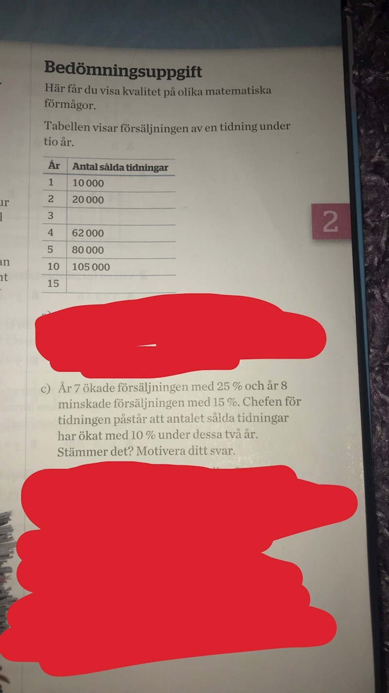 se om du kommer fram till något innan du kollar hur jag har tänkt. Börja med att teckna hur många procent av det ursprungliga som år 7 blir. Fortsätt sedan på år 8. Och räkna därefter ut en skillnad.