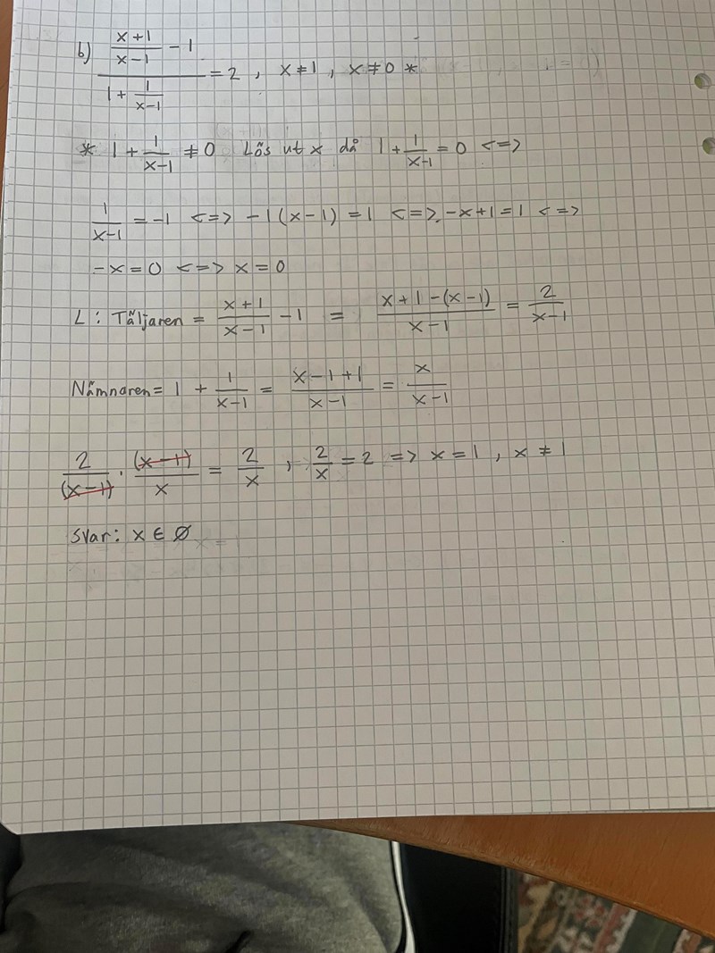 Fast så står det när jag kontrollerar svaret. Eftersom nämnaren 1 + 1/(x-1) inte får vara noll måste vi veta på vilket värde av x som 1+1/(x-1)=0, och när man löser ut det blir x lika med 0. Alltså får inte x vara lika med 0 för annars blir nämnaren lika med 0.