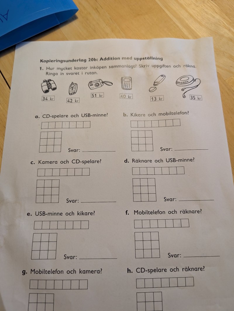 Sitter och gör matteläxa med min dotter och jag förstår inte vad övre rutmönstret är till för vid varje uppgift. Kvadraten är till för uppställning och vid svar skall det stå svaret och kr, antar jag. Med den horisontella? Ingen aning.