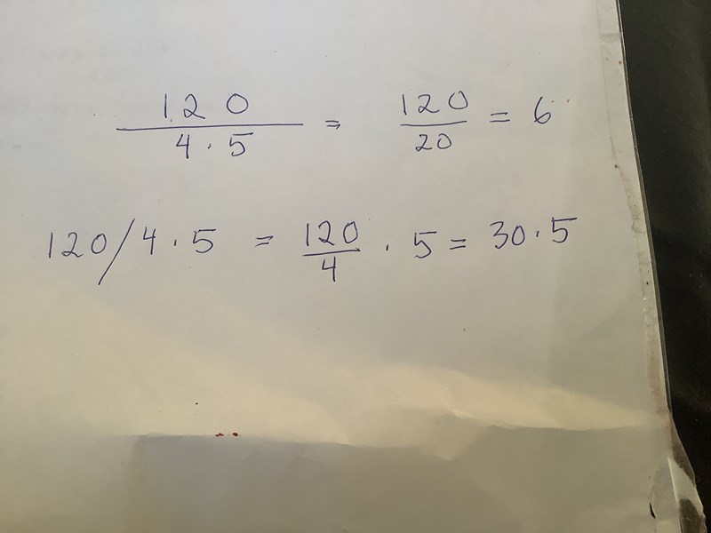 Men som jag sa, i boken står det kanske ett horisontellt bråkstreck som jag skrev på översta raden av min bild. Om det i så fall är 4x under bråkstrecket så måste man sätta ut en parentes när man gör om till en rad, dvs 120/(4x) som är något annat än 120/4x.