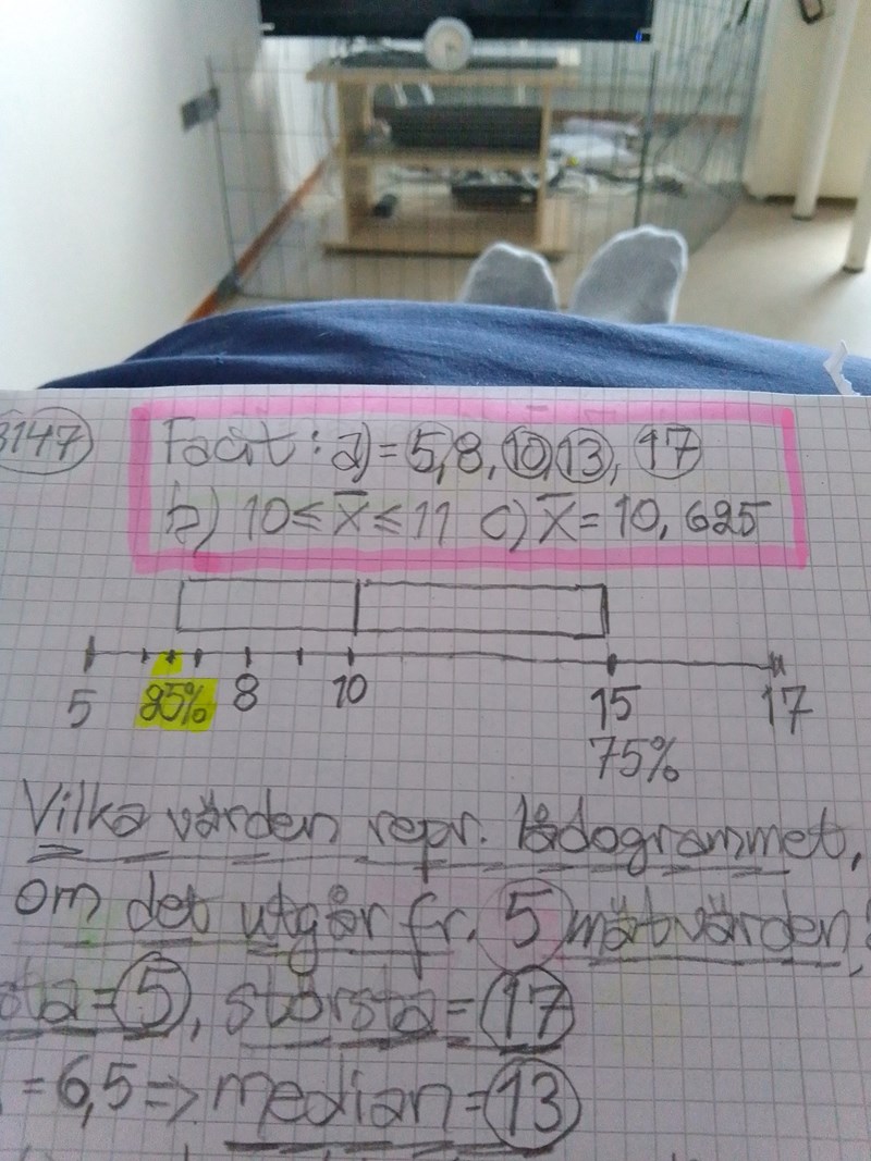 Jag ser i lådogrammet att minsta talet=5, största talet=17 och att medianen=10. Men hur i allsin dar hittar jag övriga två värden (facit säger att övriga talen är 8 och 13)?