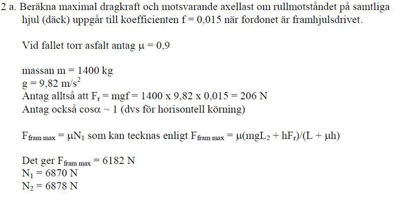 Utgå från vårt typfordon ovan, och beräkna max dragkraft och motsvarande axellast för nedanstående fall. Antag rullmoståndskoefficienten f = 0.015 båda fallen.