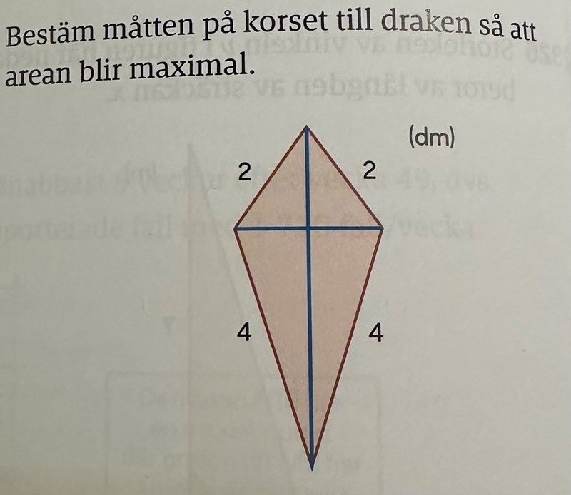Halva den korta diagonalen x, är höjd mot långa diagonalen så triangelarean tecknas på två sätt: