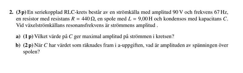 a) C genom att jag vet att Xc = XL vid det tillfället då amplituden på strömmen är störst. Sedan löste jag ut C.