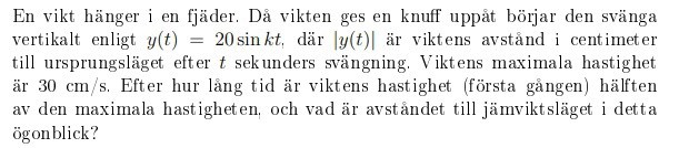är hastigheten y'(t) = k20cos(kt), vars största värde är 30