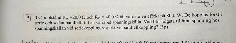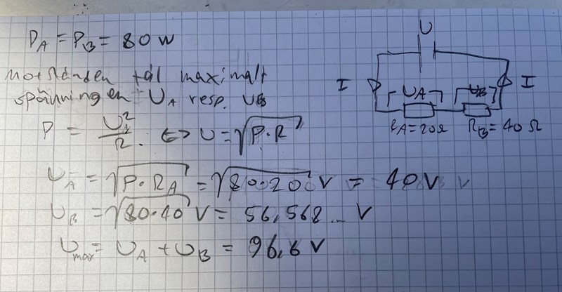 Varför blir det fel? Jag har först räknat ut vilken maximala spänning som motstånd A tål, och därefter samma fast för motstånd B. Eftersom motstånden A och B är seriekopplade så adderar man deras spänningar för att få spänningskällans maximala spänning. Men facit säger att den ska bli 68V