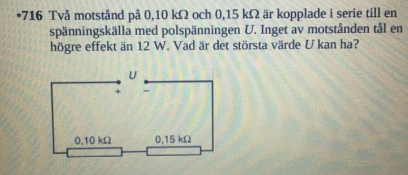 Räkna ut vilken spänning som gör att det utvecklas 12 W för varje resistor. Minsta av de beräknade värdena är den maximala tillåtna spänningen. Då får jag ca 71 V som facit.