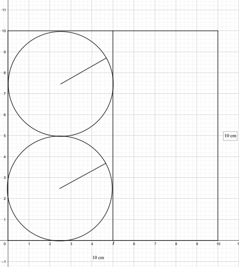 Här får man inte manipulera kvadraten. Radien fås genom sambandet som smaragdalena tipsade om, nämligen att cirkelns omkrets är sidolängden 10 cm, där igenom fås .