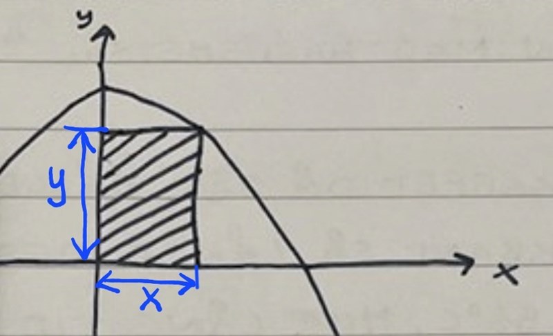 Rektangelns area är basen gånger höjden. Basen är x och höjden är y(x), detta gäller oavsett i vilken punkt vi sätter som rektangelns hörn.