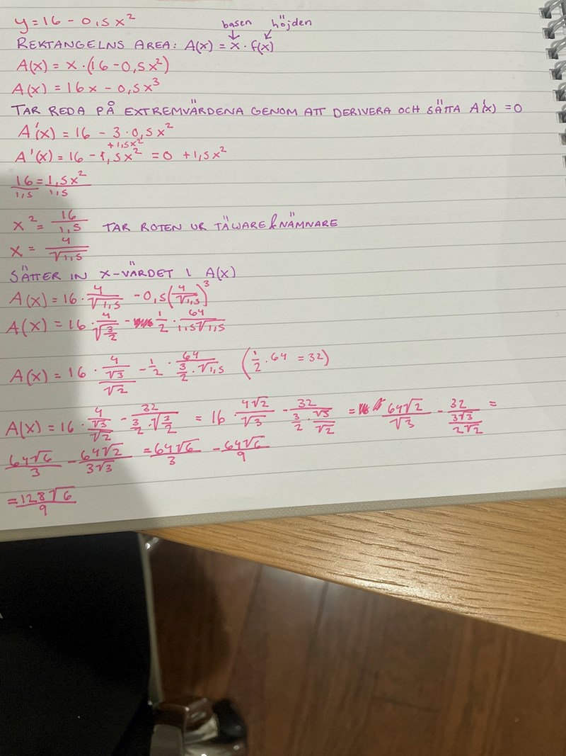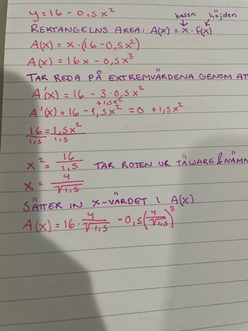 Eftersom y = 16-0,5x2 så är arean A = x•(16-0,5x2)