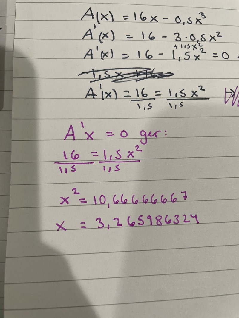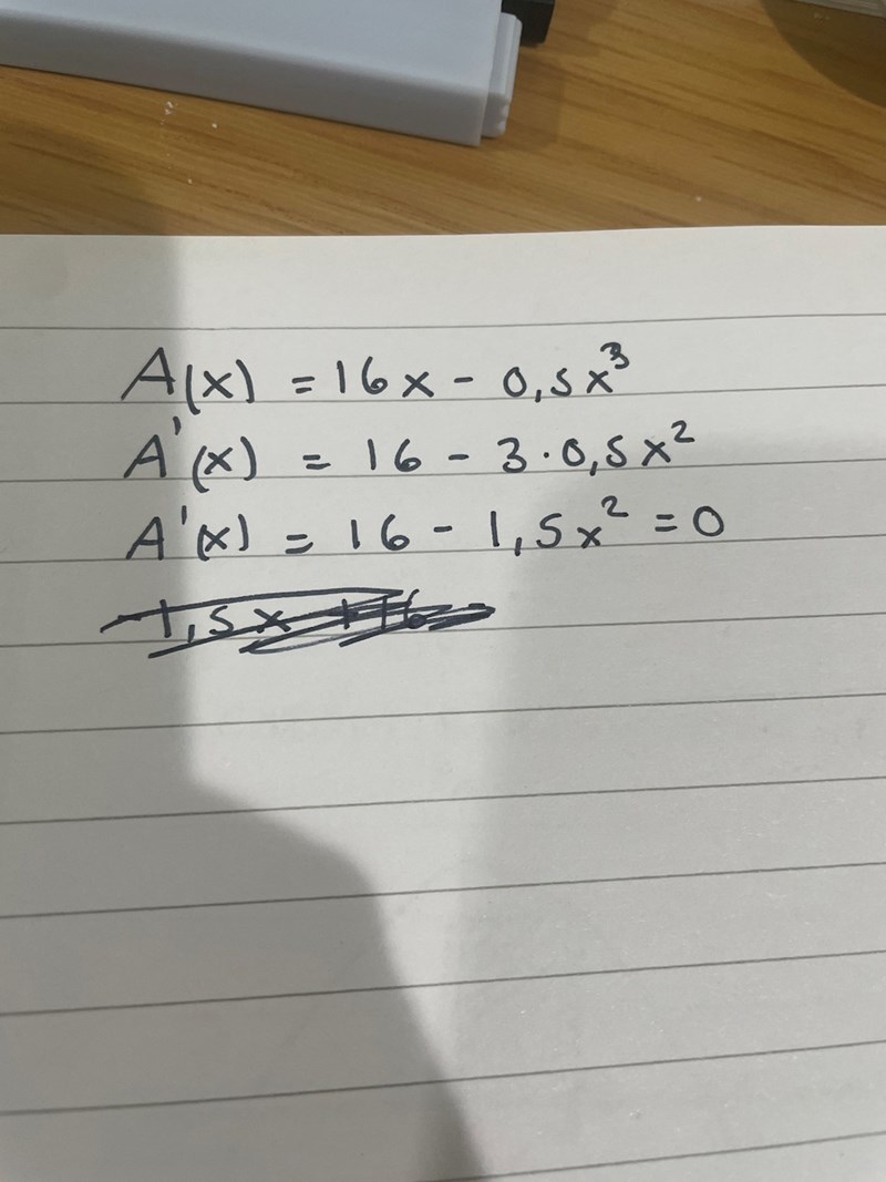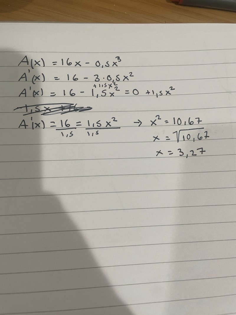 Du tänker rätt, men du skriver fel när du skriver att A'(x) = 16/1,5 = 1,5x2/1,5.