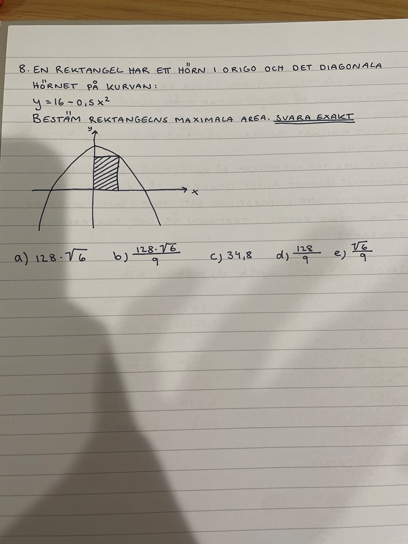 Så jag deriverar y=16-0,5x^2 och sätter =0 för att hitta extrempunkterna?