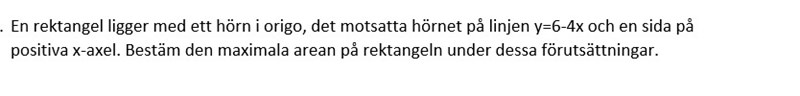 Börja med att rita så att du förstår var i koordinatsystemet rektangeln ligger. Ta sedan fram ett uttryck för hur långa rektangelns sidor är beroende på variabeln , och skriv därefter ett uttryck för rektangel area med . Du kan sedan bestämma det största värdet på areauttrycket med hjälp av derivata.