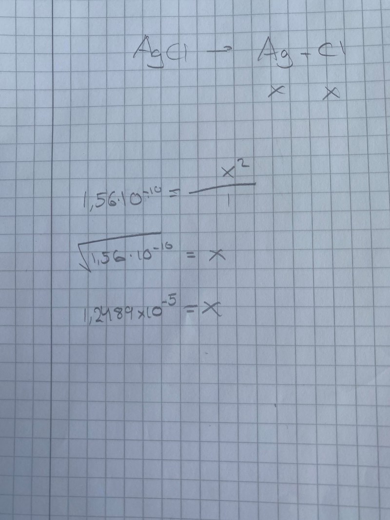 Löslighetsprodukten för AgCl (s) i vatten är 1.56*10-10mol2 *liter-1 vid 25 grader Celcius.