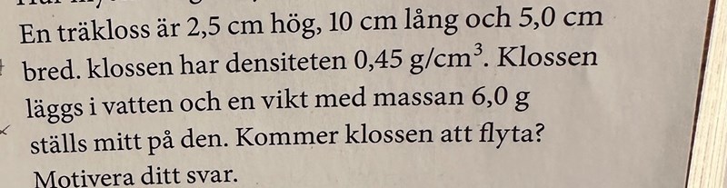 Frågan är om klossen kommer att flyta med en extra vikt. Att flyta betyder att ligga ovanpå en vätskas yta.