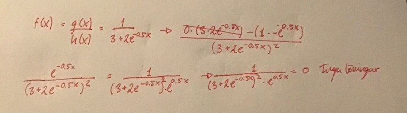 Med hjälp av kvotregeln fick jag fram att derivatan blir (1250e^(-0,5t+1))/(3). När jag lägger det =0 får jag ingen lösning?