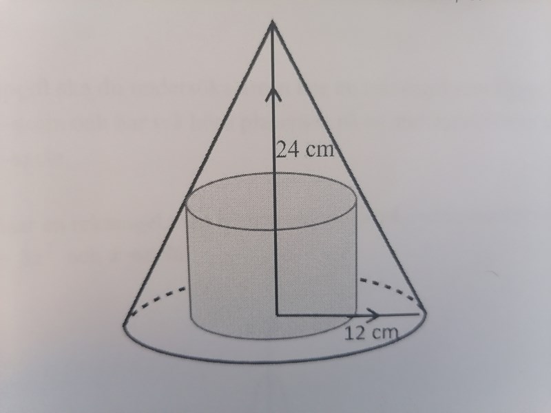 Bestäm exakt den maximala volymen av en cylinder inskriven i en kon enligt bilden nedan. Konen har radien 12 cm och höjden 24 cm.