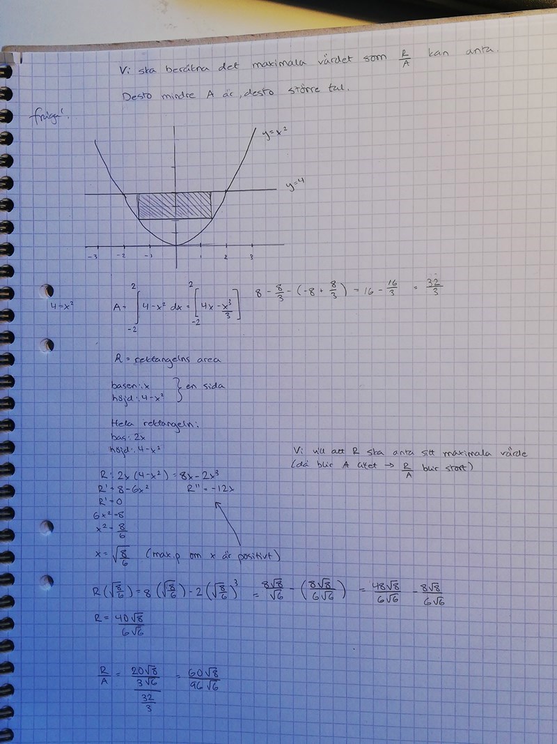 "I figuren har man ritat kurvan y=och linjen y=4.Arean som begränsas av kurvan och linjen kallas A.I området mellan kurvan och linjen har man också inskrivit en rektangel (streckad)med arean R. Beräkna det maximala värde som förhållandet R/A kan anta."