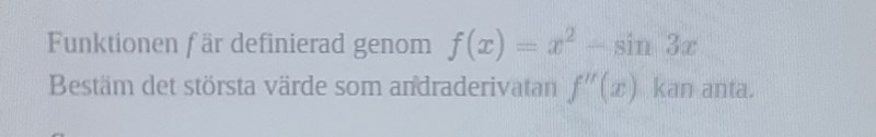 Hej jag behöver hjälp med denna uppgift. Jag räknade ut andraderivatan till 2+9sin3x sen vet jag inte vad jag ska göra.