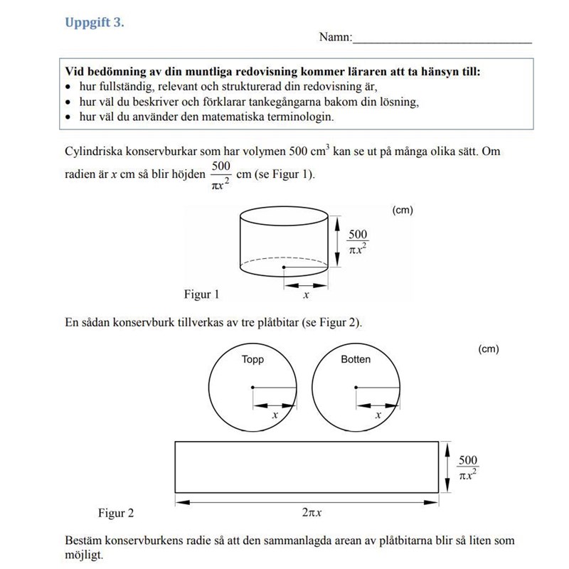 Du kan lösa problemet genom att ställa upp en modell för hur den sammanlagda arean beror på radien x och hitta funktionens minimipunkt.