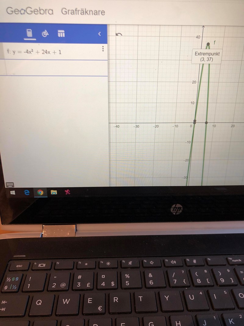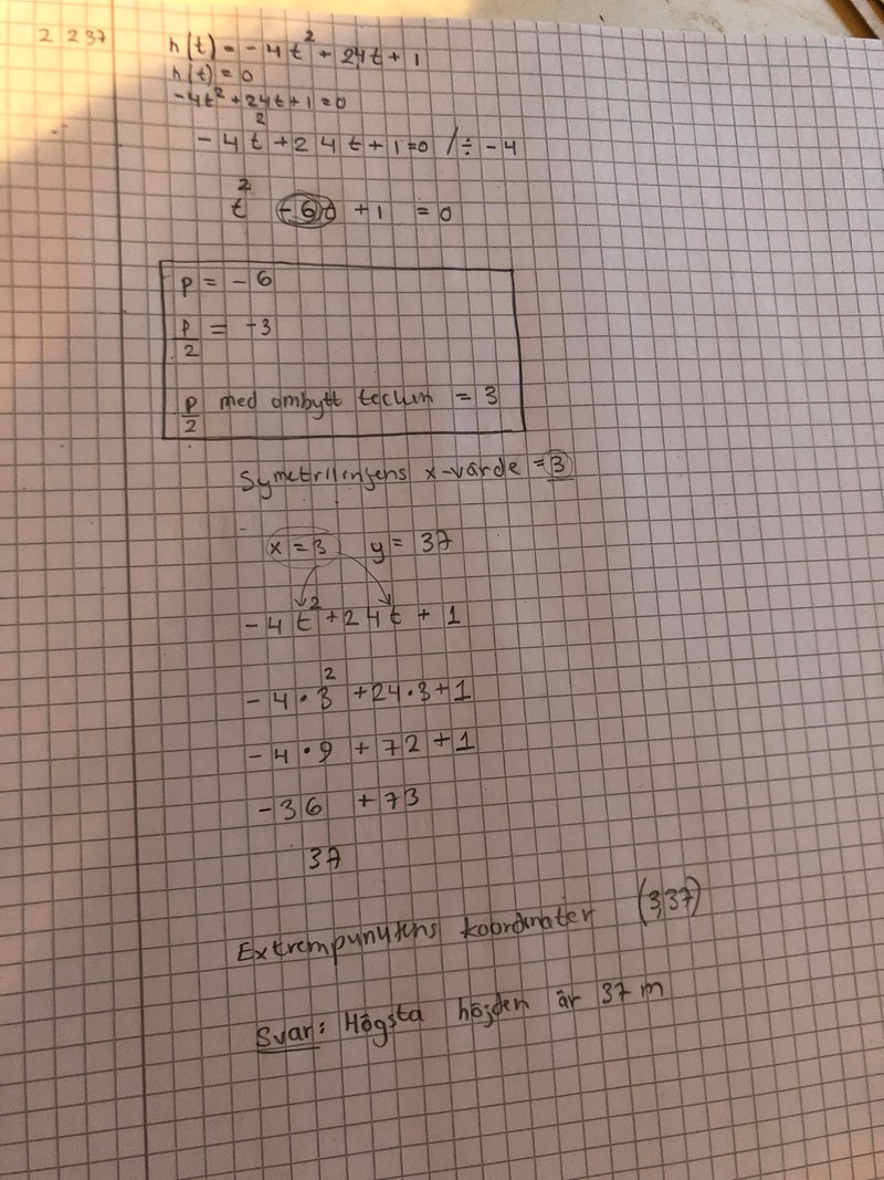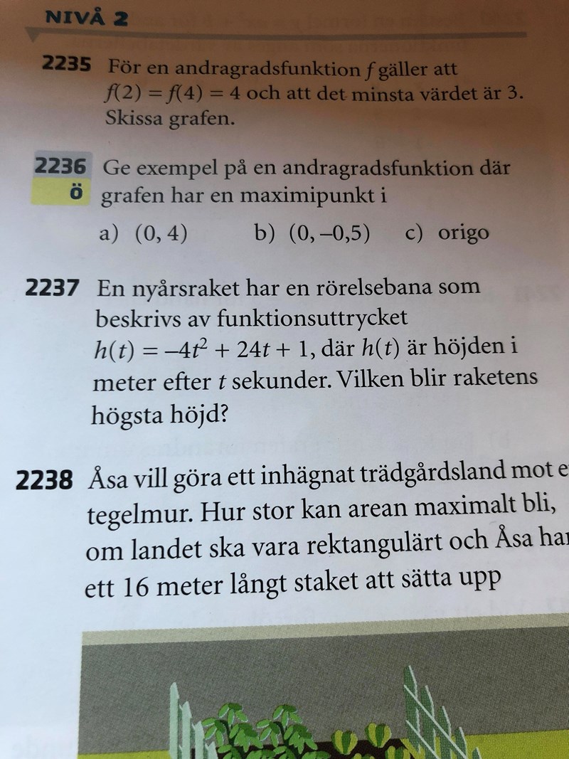Hej jag har en fråga angående uppgift 2237. Jag vet inte riktigt hur jag ska göra. Jag antar att man vill få fram maximipunkten, men ska jag då först ta reda på nollställena, sedan symetrilinje och stoppa in det i funktionen för att få y till extrempunkten? För det funkar inte hittills.