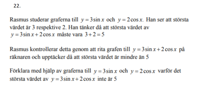 Ture skrev:Du ser i grafen att 3sin(x) och 2cos(x) har sina resp max för olika värden på x. Summan av de två funktionerna kan därför aldrig bli 5 utan måste alltid vara mindre.