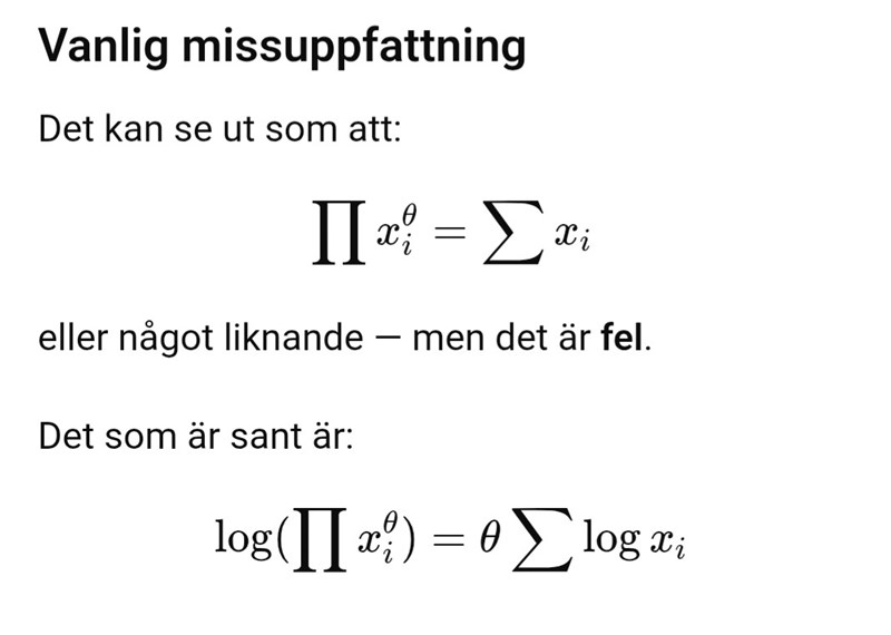 AI försöker säga att den där summan dyker upp när man tar log av x med index i, medan man summerar från i=1 till n innan man tar log på det och AI säger att man ska ta log av produkten vilket ger en summa (förståeligt). En assistent i kursen summerade först och sen tog hon log på summan. Varför summerar man när det är produkten xi innan man tar log?