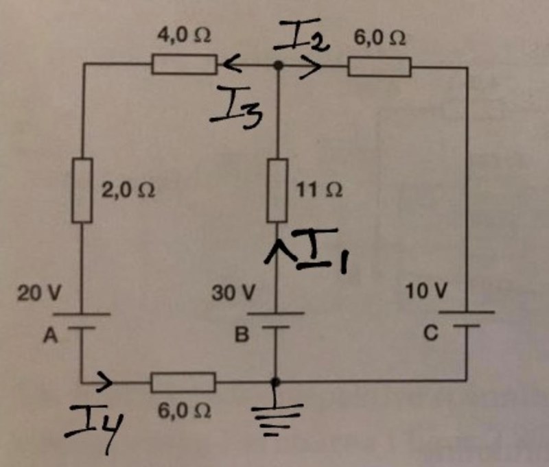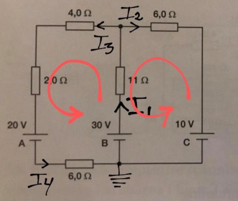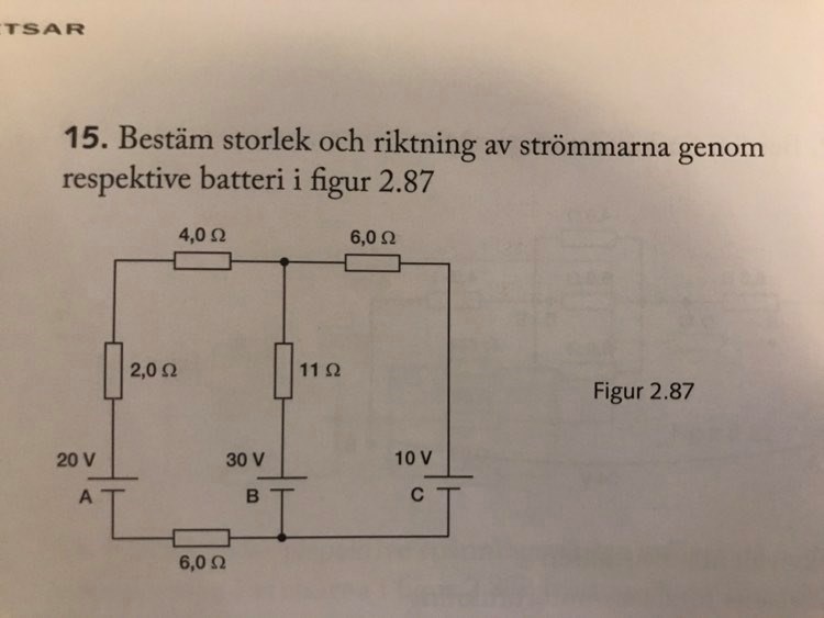 För enligt uppgiften är det 3 strömmar som man ska bestämma storleken och riktningen på. Har lite svårt att veta hur dessa tre strömmar går? För sen räknar jag väl bara från spänningskällan med alla spänningsbortfall som blir för respektive ström?