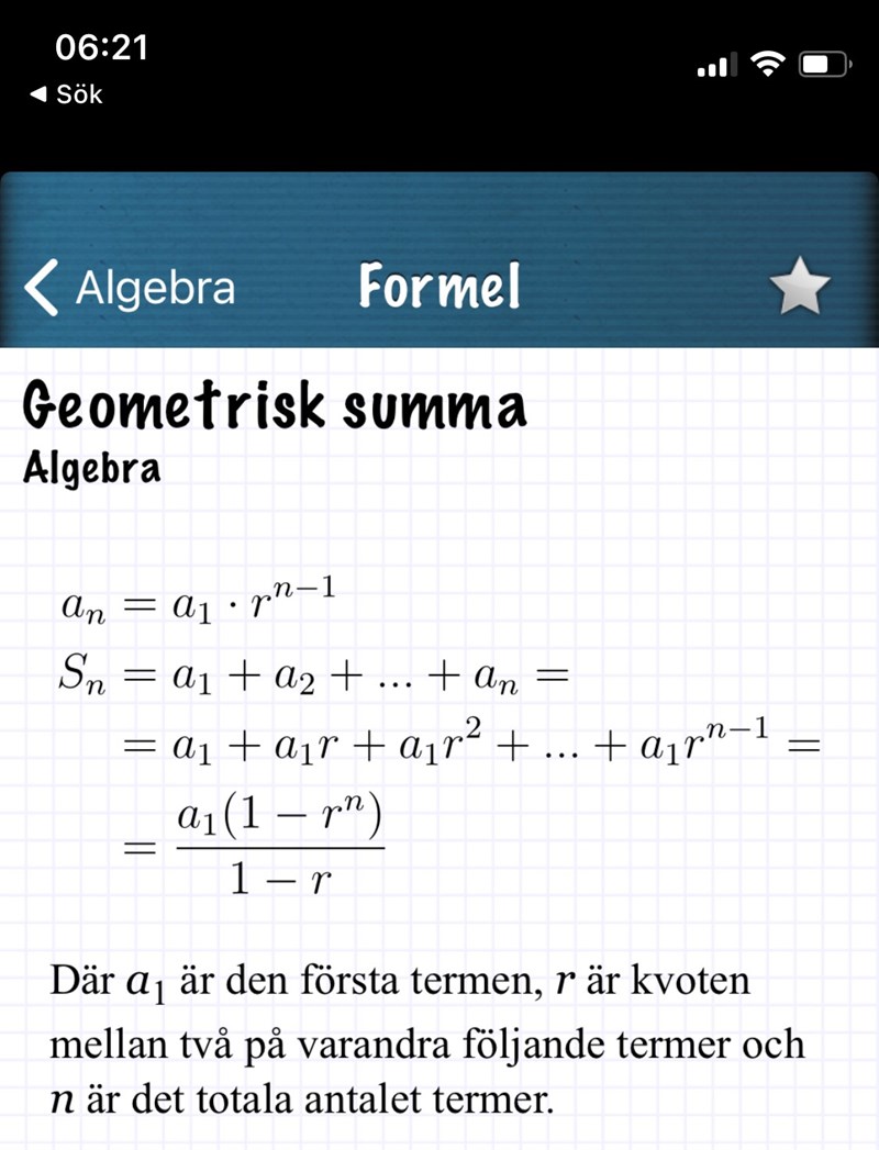 Försök jämföra formeln nedan med den du har. Kan du sätta a1a_1, rr och nn så att de blir lika?