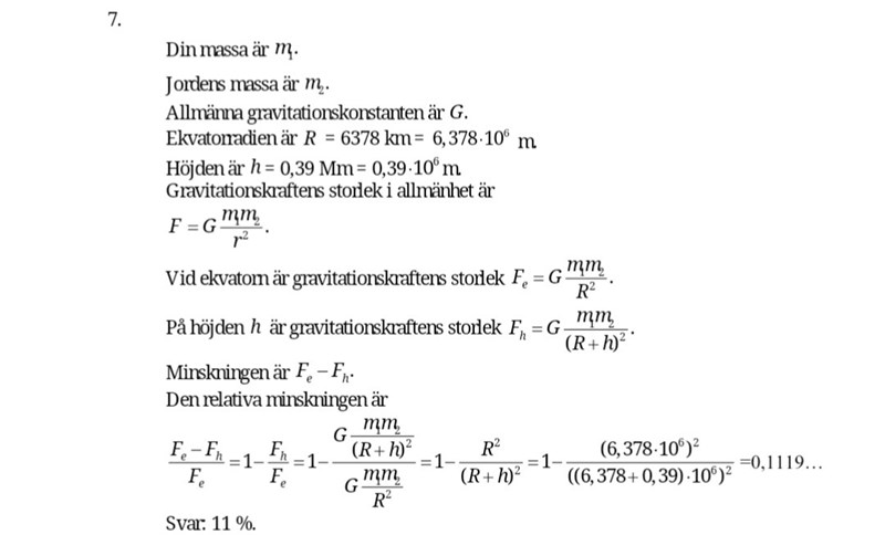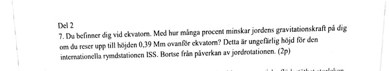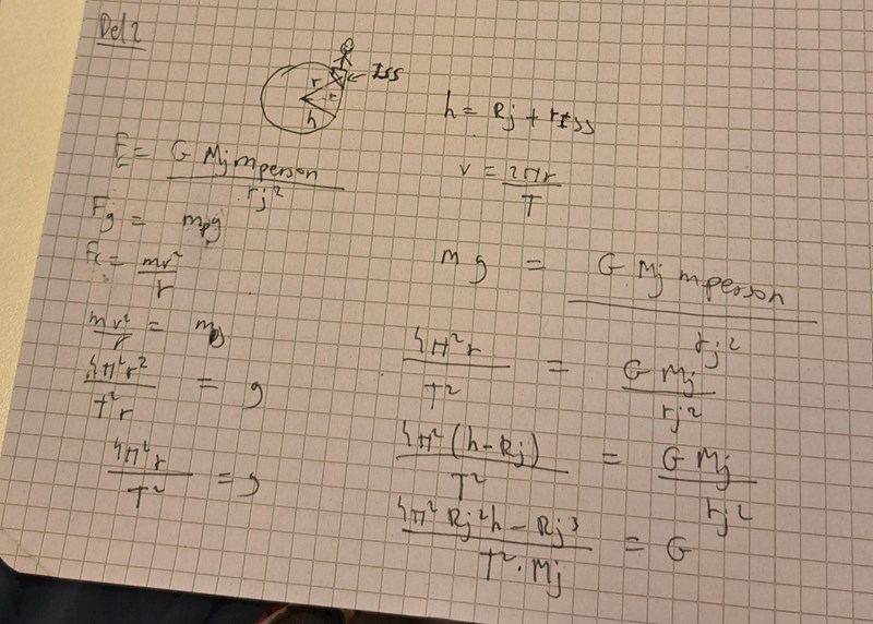 Jag började med ställa upp mg= GMjmperson/r^2 Sen visste jag att Fc=mperson*g pga det är cirkulär rörelse och hittade uttryck för g och använde den för att få ut vad G är för något. Sen drog jag bort givna G ur formelsamling från vårt nya G och dividerade med gamla G för att få i procent. Om denna metod är felaktig kommer jag ej på annan metod.