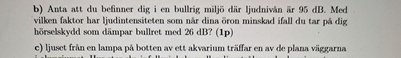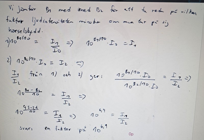 Nej det gör du inte. Men lösningen använder sig av Ibuller/Iöra=1095/10/1069/10 för att hitta faktor. Varför ställer de upp såhär och varför är det 69 i exponenten och inte 26? En annan sak jag undrar är om skillnaden i ljudnivå som är 26 dB är samma som förändringen 26 dB?