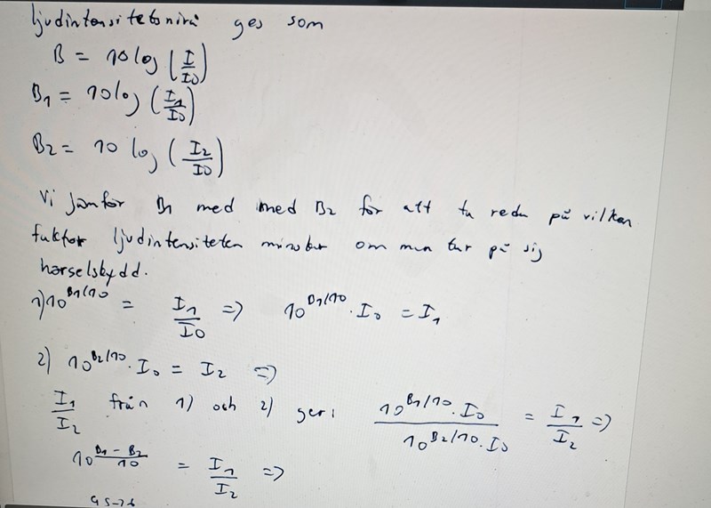 Just ljudnivå i dB är log av kvoten av två ljudintensiteter. Du får nivån; uppgiften frågar efter kvoten.