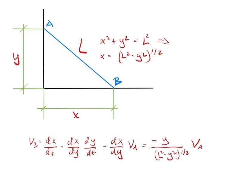 v är hastigheten för A och u är är hastigheten stegens andra ände B glider utmed marken