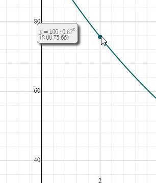Grafen jag får visar då att det exakta y-värdet då x = 2 är 75,66.