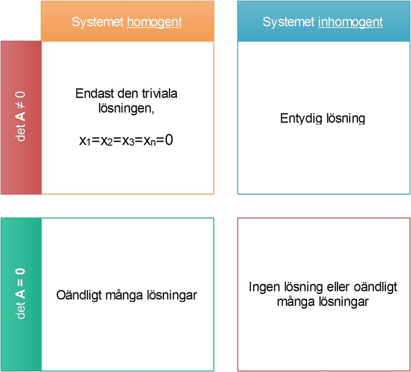 Detta är en nyttig matris att ha i huvudet. Vi är nu intresserade av homogena system (=0). Från diagrammet (som vi kan utantill) förstår vi att är ett villkor för linjärt oberoende. Då har systemet endast triviala lösningar .