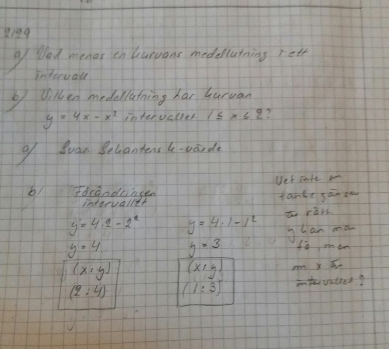 Nu var det prat om medel lutning. Då ska man ta reda på två punkter först och dess koordinater. Jag fick reda på funktionen först dit jag skulle stoppa där det stod x alltså x värden för att få veta y värden. Då kom fram alltså koordinaterna. Att sedan ta reda på k-värde är inga problem alls. I det här var nu frågan om intervallet och förändringen. Den räta linjens k värde är samma sak som räta linjens k värde, när det gäller funktioner.