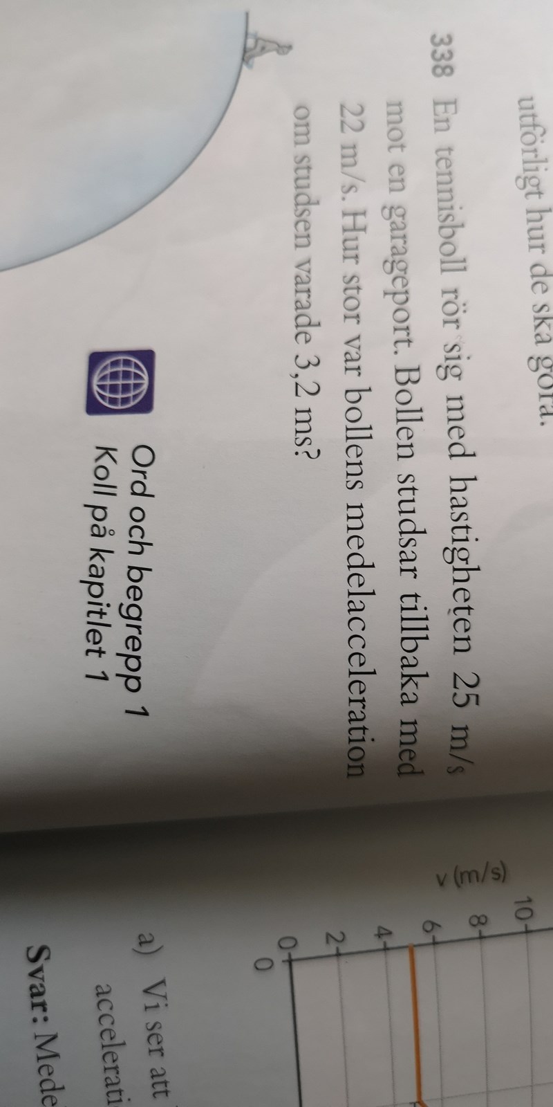 En hastighetsminskning med endast 3 m/s skulle glra att bollen fortsätter i samma riktning, dvs genom garageporten, med hastigheten 22 m/s.