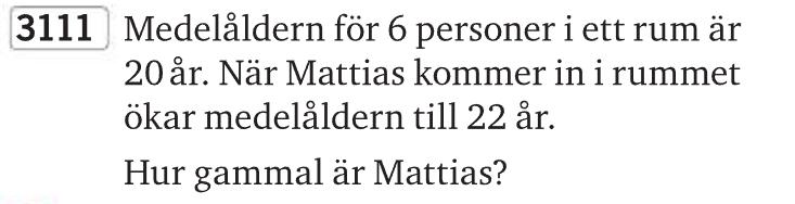 Mohammad Abdalla skrev:Börja med att beräkna hur gamla de 6 personerna är sammanlagt. alltså 6X20 = 120 år.