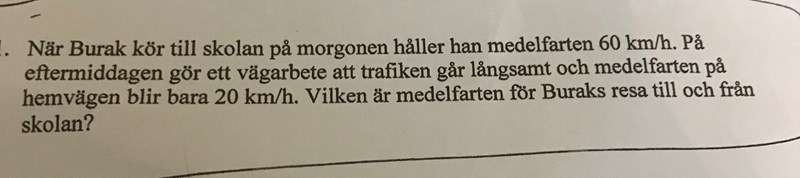 Att svaret inte kan vara hastigheternas medelvärde (här 40 km/h) kan man inse genom att tänka sig ett annat fall där en av hastigheterna är nära noll. Den tiden, och därmed den sammanlagda tiden, blir då mycket lång. Även medelhastigheten blir nära noll.