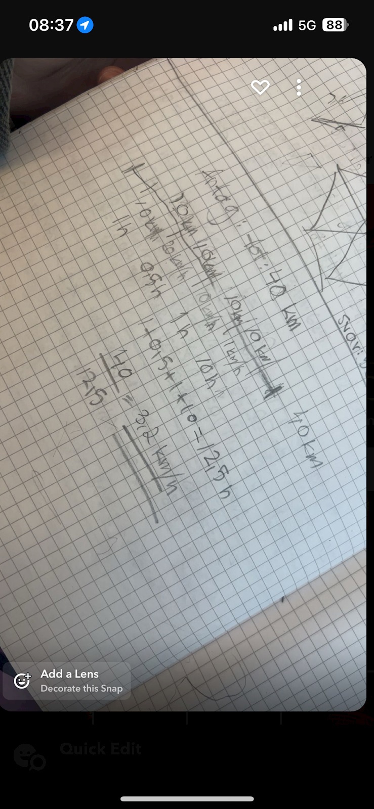 Du kan sätta varje sträcka till 1 km. Beräkna hur lång tid varje sträcka tar. Summera alla tiderna, sedan tar du 4km/totala tiden.