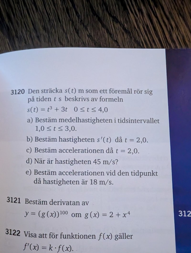 Jag tog derivatan av sträcka funktionen och sedan värdet vid t= 3 och t=1 och adderade dom, sedan dividerade jag med två. Det är fel och jag har inga andra ideér.