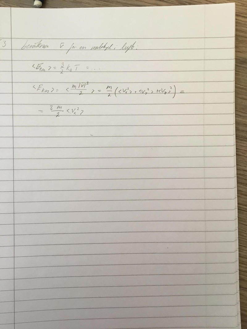 Som rubriken säger vill jag räkna ut Medelhastigheten för en molekyl i luft. Jag tänker att jag kan använda den kinetiska energin såhär men vad ska massan vara? Ska det gälla för en syremolekyl tex eller hur ska jag tänka