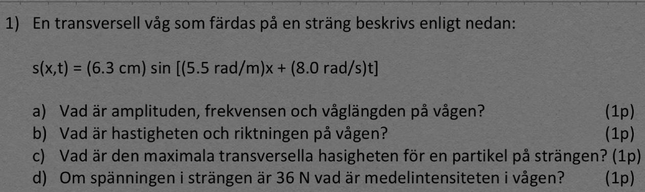 vet inte riktigt hur jag ska börja, jag har räknat ut f=1.27Hz, lambda=1.1m, v=1.5m/s samt den maximala transversella hastigheten på en partikel till 50cm/s, är enheten rätt här.