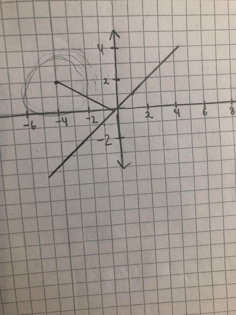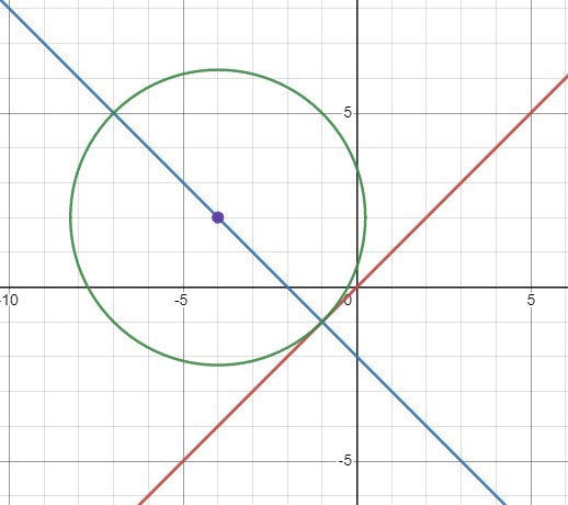Om den skall tangera linjen y=x så skulle en linje från tangeringspunkten till cirkelns mitt vara 90 grader gentemot y=x. Om du försöker rita ut y= x i grafen får du en linje som då du rör dig ett steg i x-led rör du dig ett steg i y-led; linjen som går mellan (-4,2) och (0,0) skulle röra sig ett halvt steg i neråt i y-led då man rör sig ett steg i x-led. Detta är inte vinkelrätt.